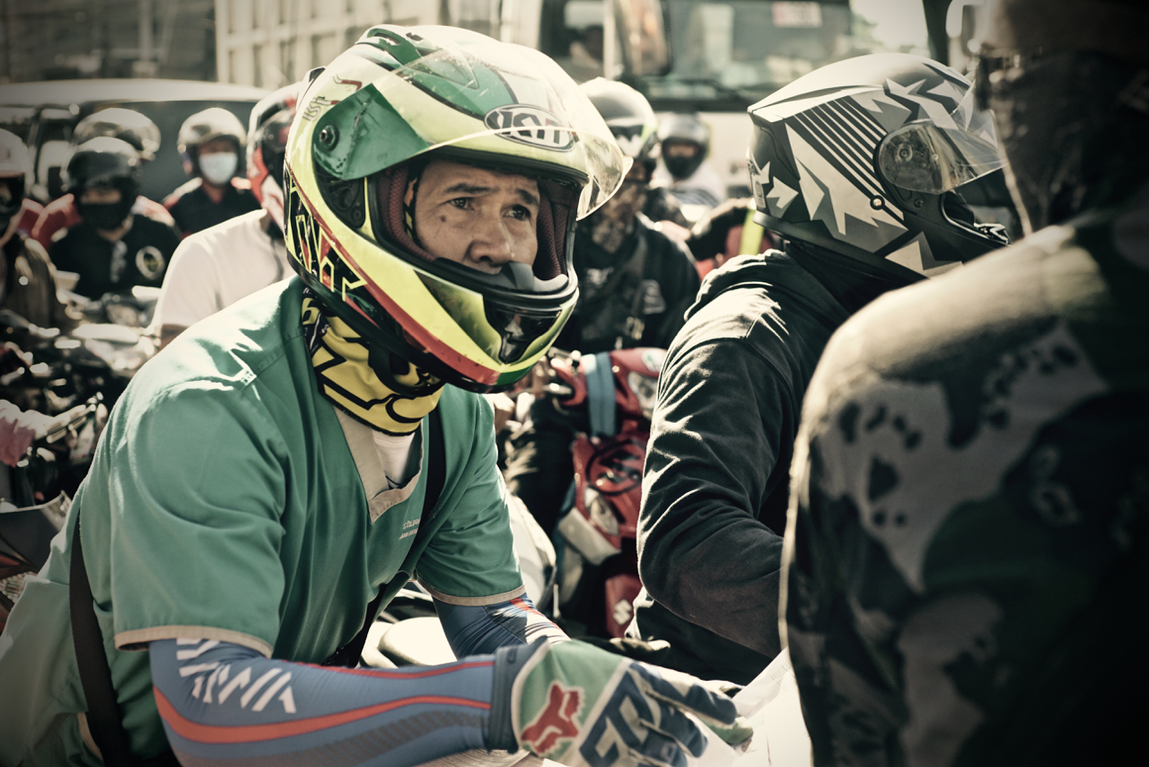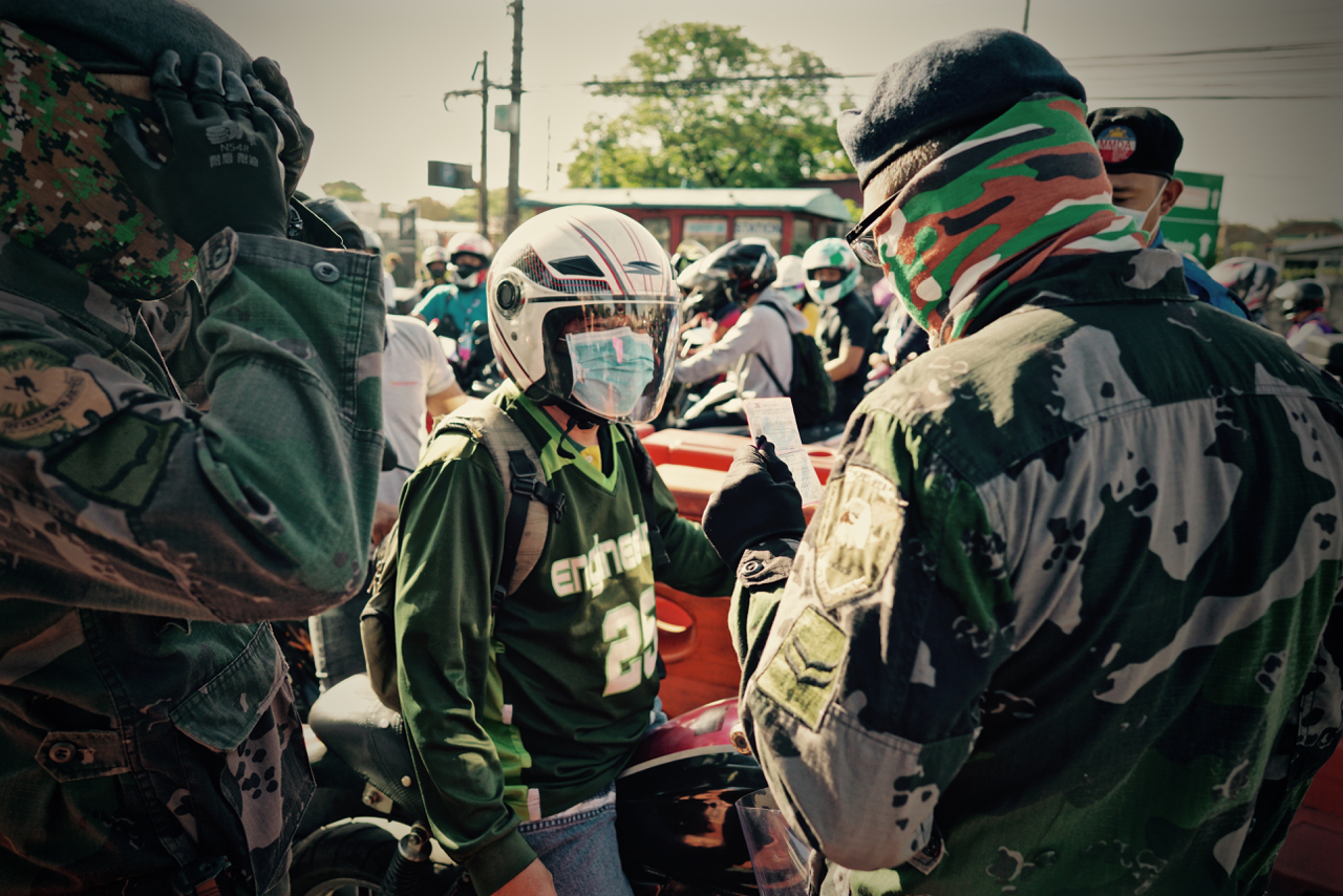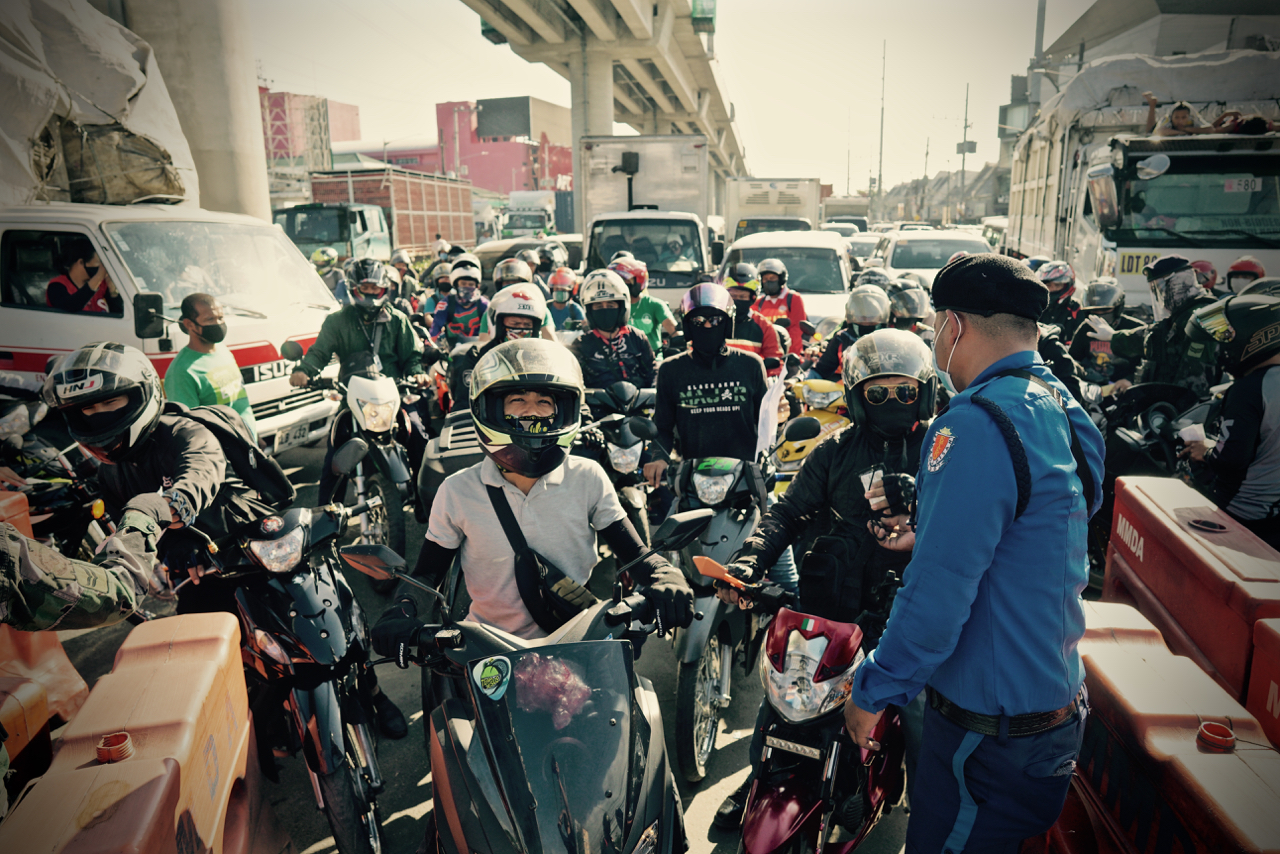 It is a 50mm lens so I’m constantly checking my manual focus since I am always moving and shifting composition. My watch says it’s 8:30 am and I’m beginning to feel the sun’s heat on my nape. The morning sun is also blinding the lens while I am framing this frail man in front of me who seems to be dazed with what’s happening around him. On my far left is an old man who walked for two hours from his home to see his doctor and is convincing the police to let him pass. To my right is a service driver tasked to deliver gallons of blood to a blood bank arguing with another policeman. Another on the frontline is an office messenger who is in a rush for work, showing his identification card. I overhear a mother with her daughter pleading so she can visit her sick father and everywhere, there are around 60 motor riders who have been waiting for three hours to cross the checkpoint.