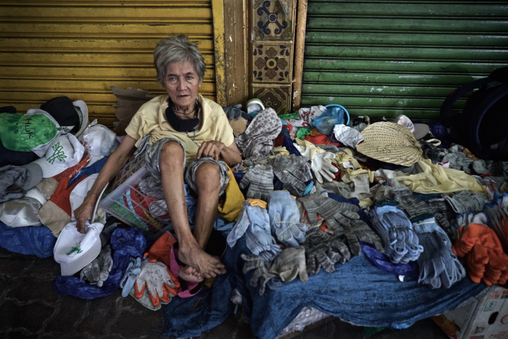 Manila vendor Merle Abad, 70 years old sells industrial gloves along the sidewalk of Rizal Avenue. Despite the enhanced community quarantine, she is still forced to go to the streets and sell her products in order to survive. She has sold one pair of gloves so far when I took her picture and it’s almost 5 pm.
