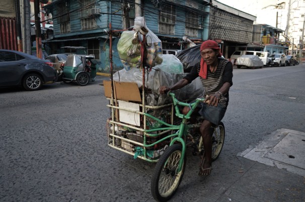 Tony de Vera, 54 years old. His home is his side-car. His survival depends on gathering trash and selling them to recycling shops. He has been roaming around the old Manila district the whole day.