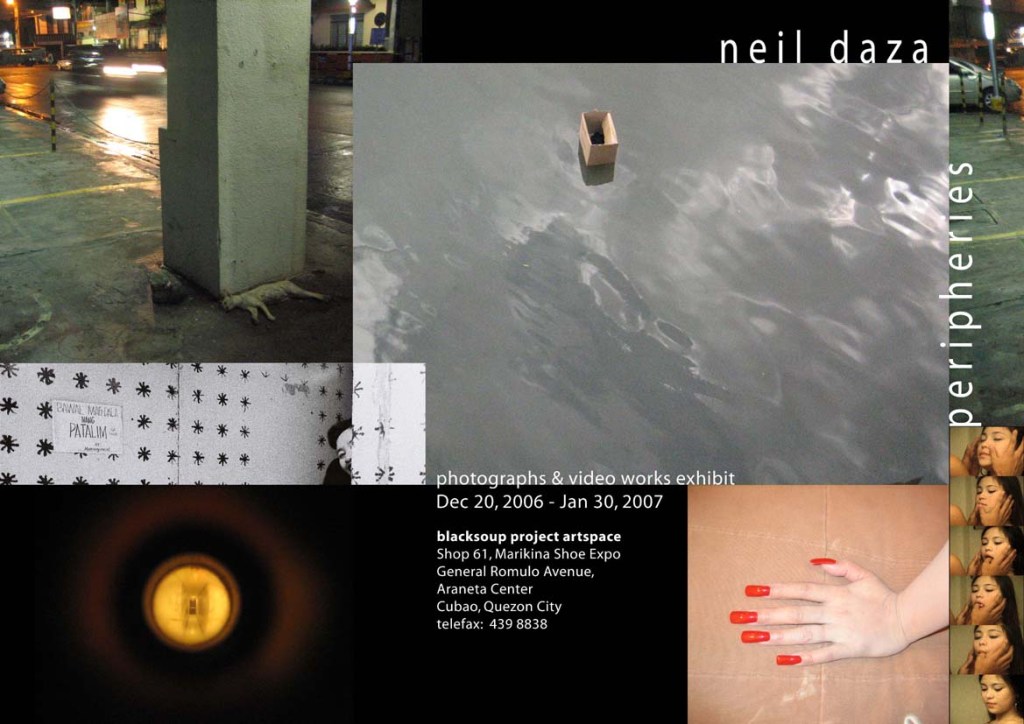A dog sprawled along a busy street, bloodied and lifeless. An aged taxi driver by his wheels perpetually in search of a passenger. A transsexual in Malate displaying evidence of his instant sex change. These are just some of the most striking images from the visual chronicle of Neil Daza, filmmaker and photographer, titled “Peripheries,” opening Dec. 20 at the Black Soup Art Space (former Cubao Shoe Expo, Quezon City).