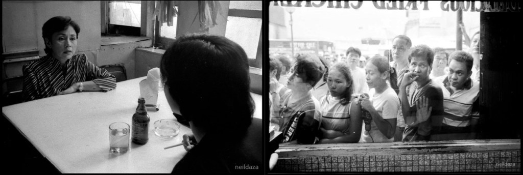 The photographs of Neil Daza are products of light. They are also documents of a life spent making movies. Each picture is of a particular moment: an actor in contemplation between camera set-ups, a crowd of movie fans gathered on the margins of a film set, a ticket seller waiting and expecting for someone to approach, a projectionist watching for when to change reels or maybe for the feature to end. Yet taken as a collection they also chronicle a 25-year period wherein one era of Filipino cinema dissolved so quickly to the next that it was perhaps only perceptible to have shifted in hindsight. In effect, they are both portraits of cinema’s recent past and still frames in the narrative of its unfolding future.